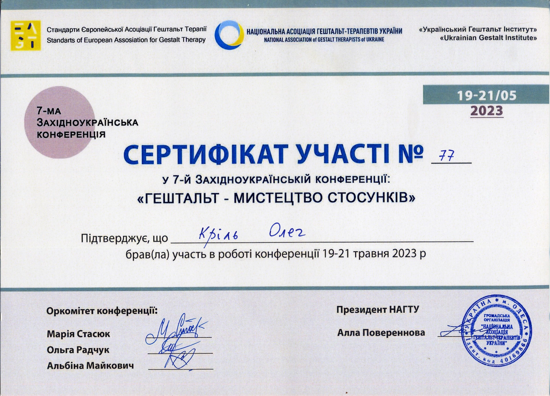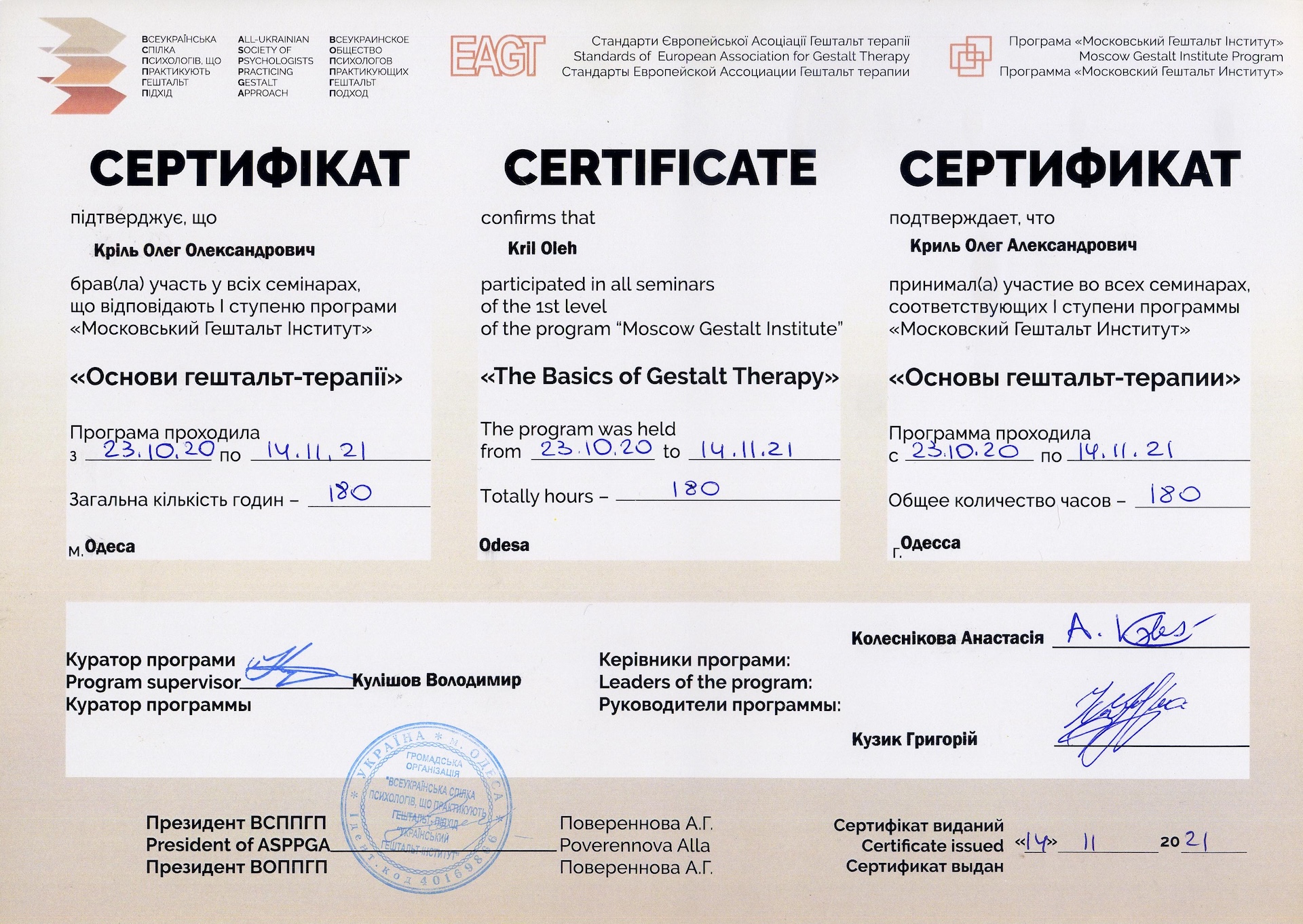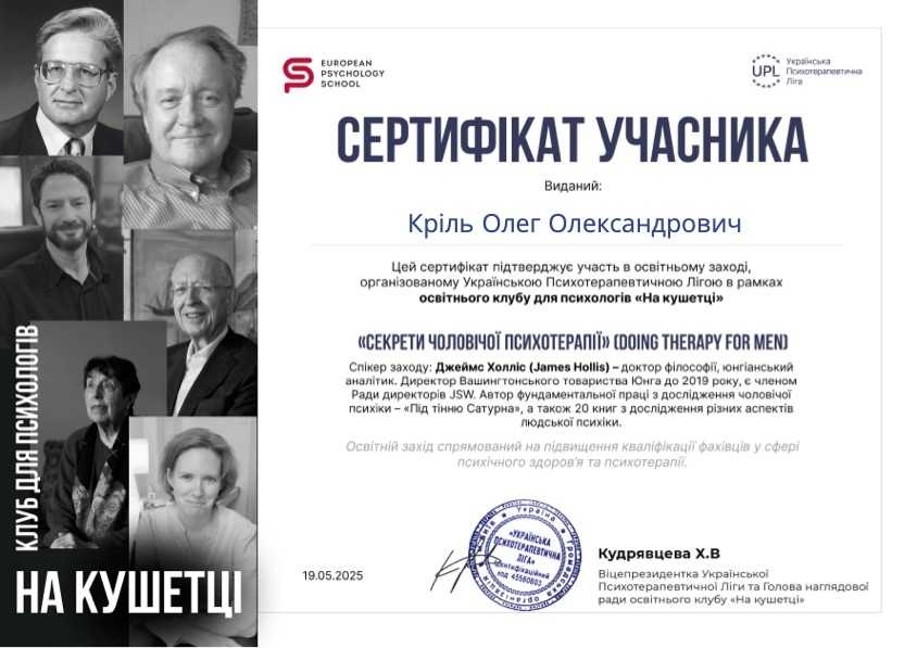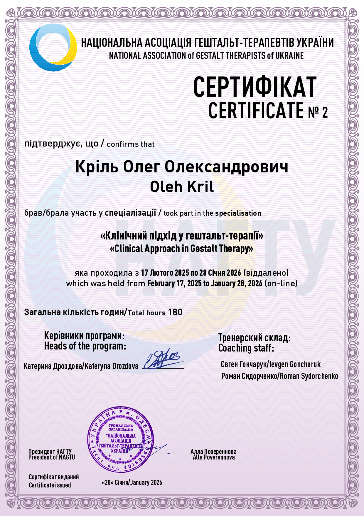 Момент коли я пішов в особисту терапію почався після розриву довготривалих стосунків і пізніше переріс в моє навчання на 1-ій ступені. Захоплювало і утримувало в процесі: щирість, емоційність та глибина контакту.