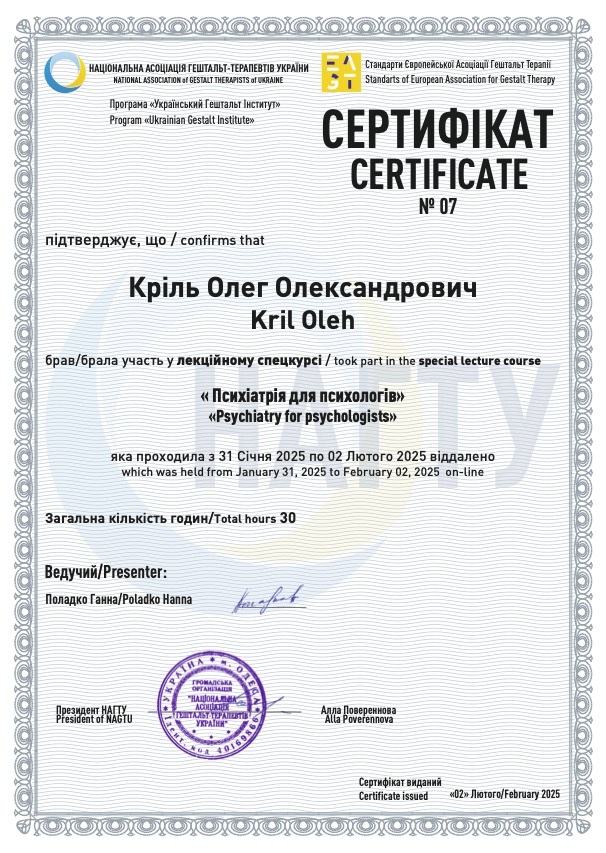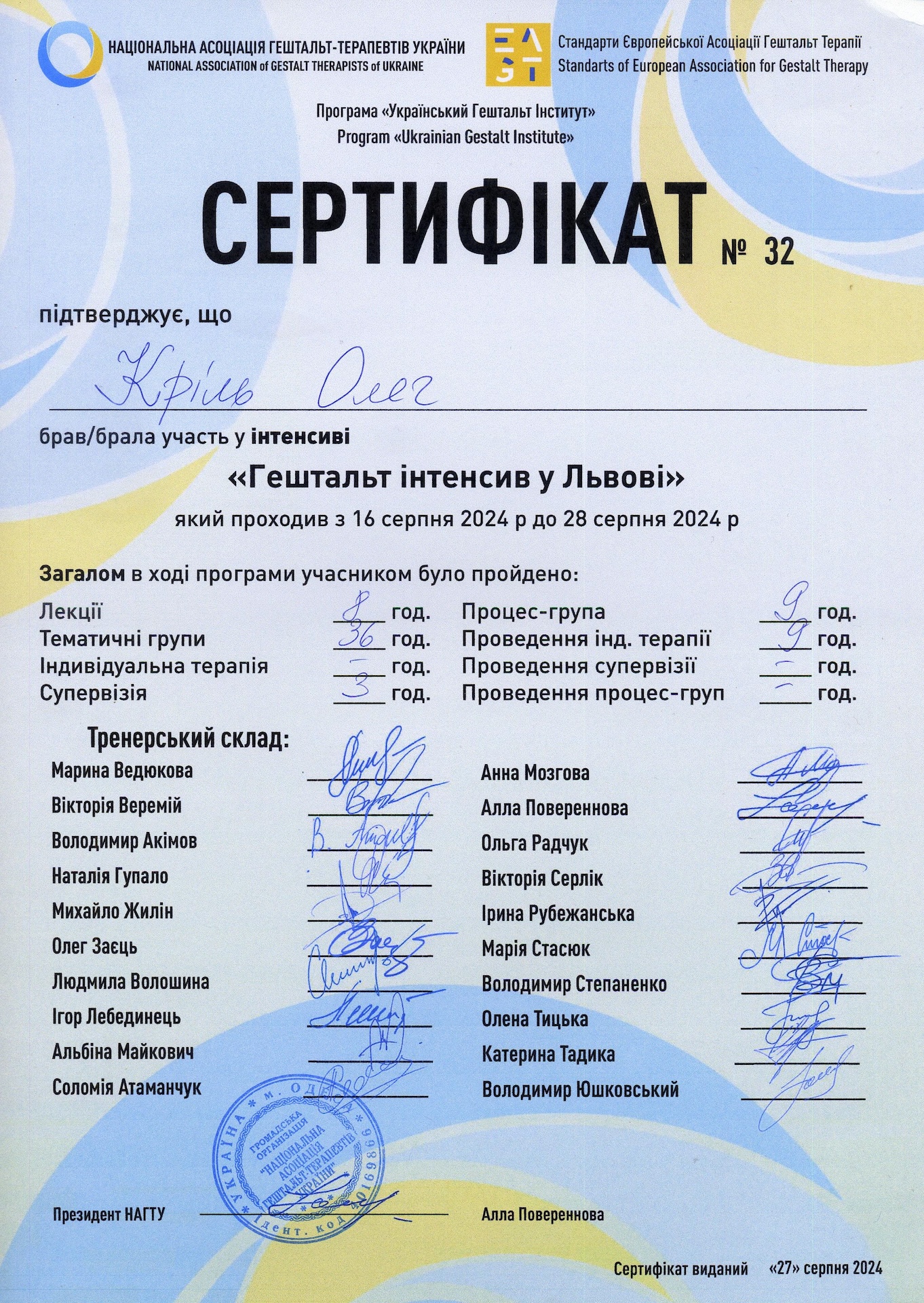 Невеличкий простір навчання, роздумів та рефлексії щодо гештальт теорії та практики. Станом на сьогодні (13 лютого 2025р), студент 2-ої ступені НАГТУ. Не претендую на правильність, істину в своїх дописах. Можу мати іншу точку зору, можу помилятися і готовий слухати і говорити про інші погляди з повагою один до одного.